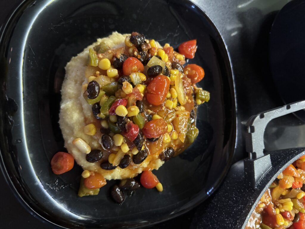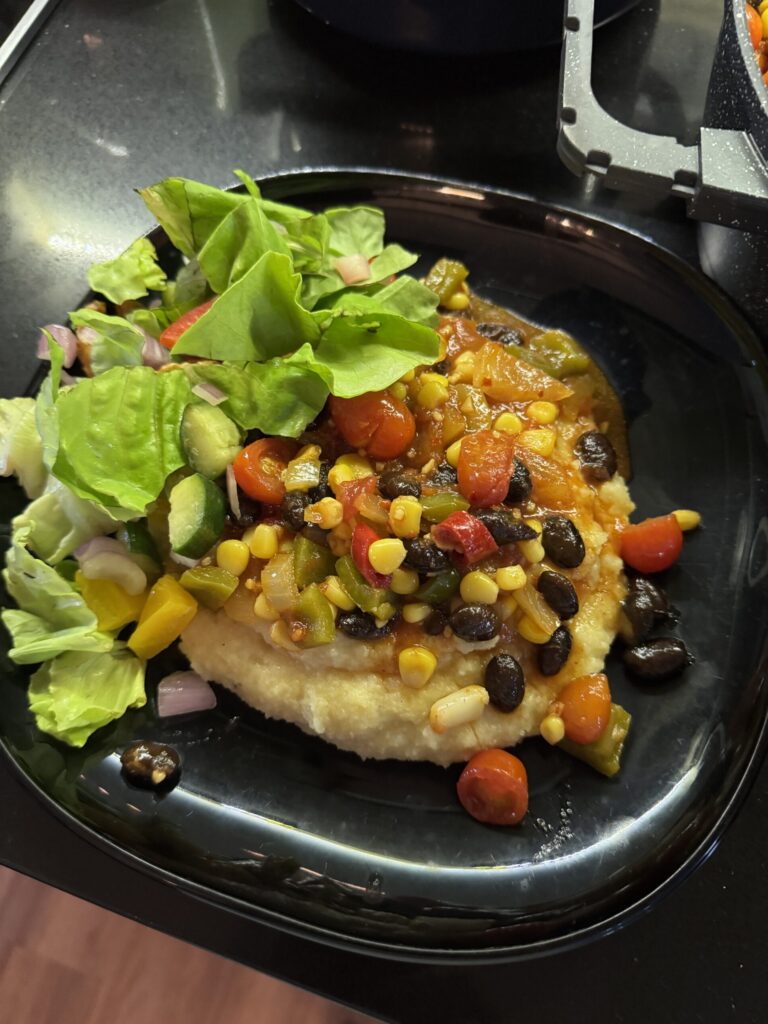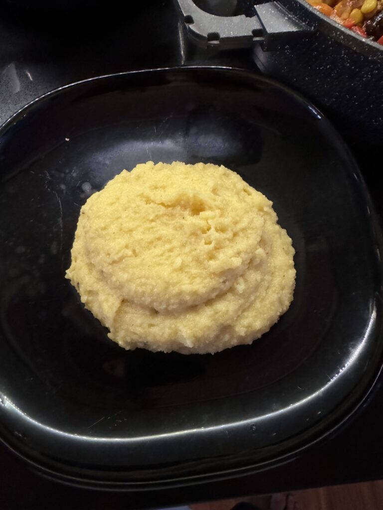 In dit verrukkelijke fusiongerecht ontmoet romige Italiaanse polenta de pittig-hartige smaken van de Mexicaanse keuken. Roma-tomaten (perfect voor sauzen vanwege hun stevige vruchtvlees en minimale zaadjes) worden gestoofd met maïs, zwarte bonen, paprika en een mix van Zuidwest-Amerikaanse kruiden. Het resultaat? Een onweerstaanbare Tex-Mex saus! Fijngesneden jalapeño zorgt voor een subtiele pittigheid die diep doordringt in de fluweelzachte polenta en je gegarandeerd de schaal laat uitlepelen.