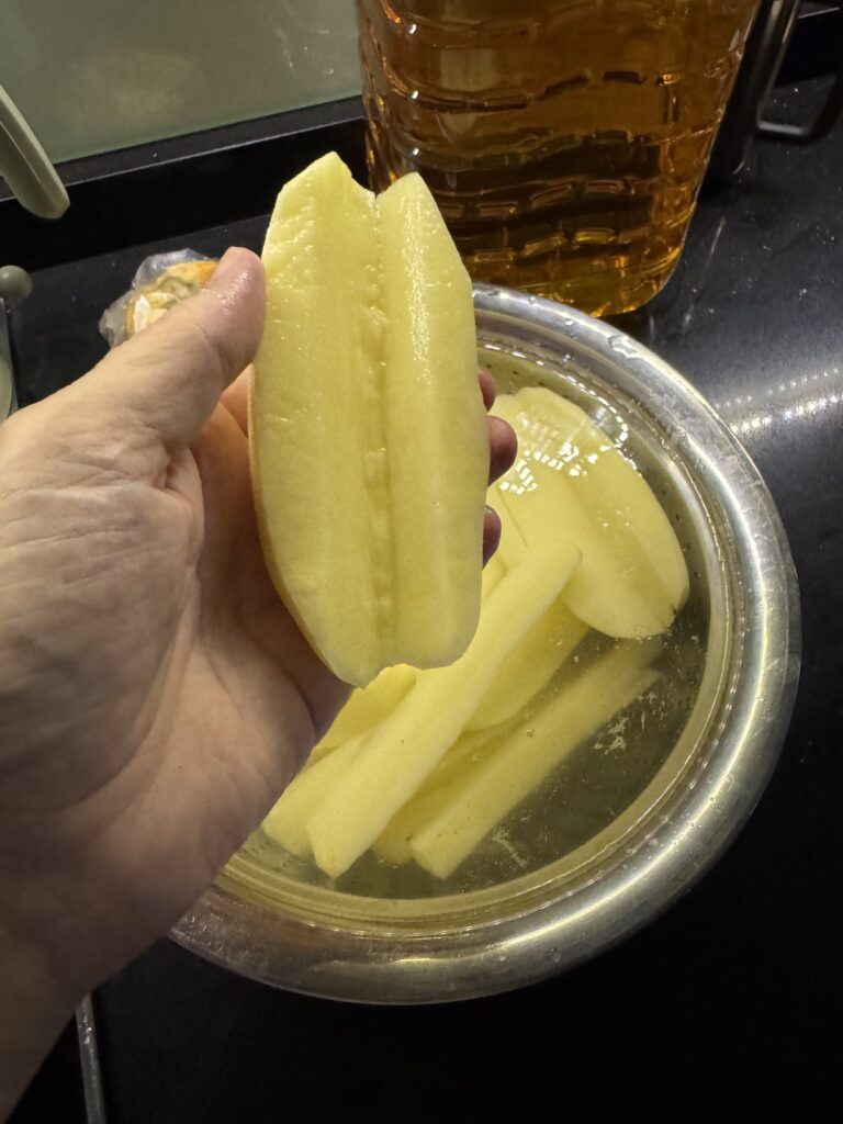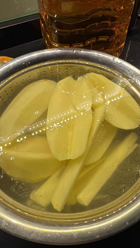 - Leg de gesneden aardappelen in water om ze vers te houden.