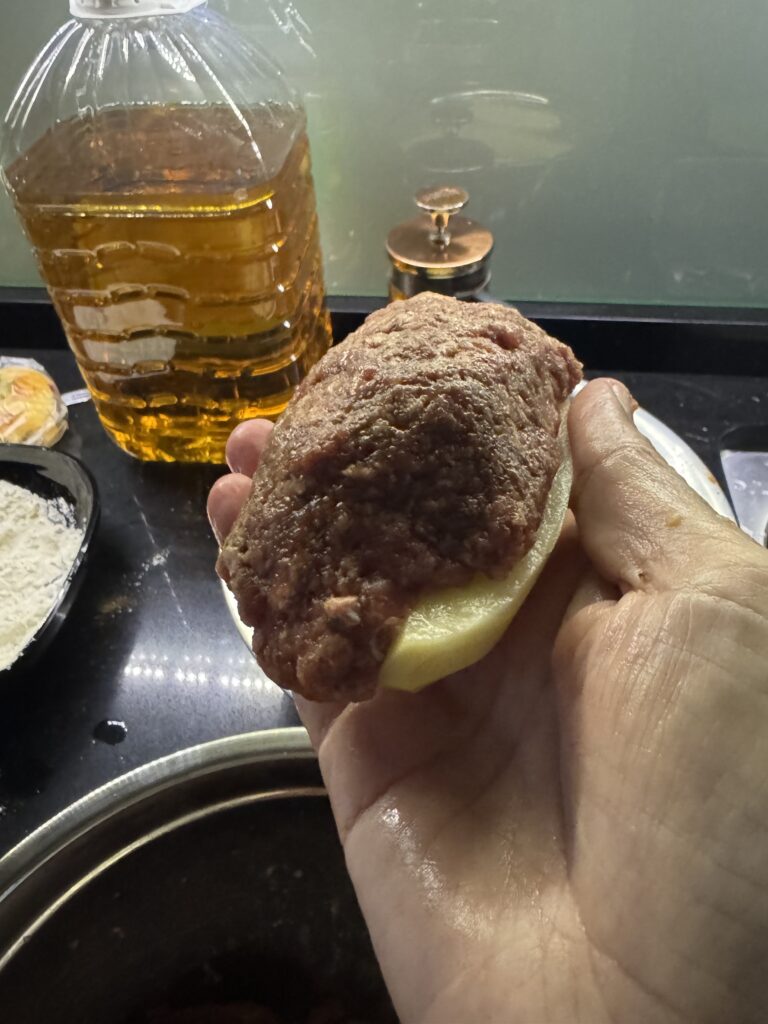 - Neem een kleine hoeveelheid van het vleesmengsel (ongeveer ter grootte van een golfbal) en vul de inkeping in de aardappel.