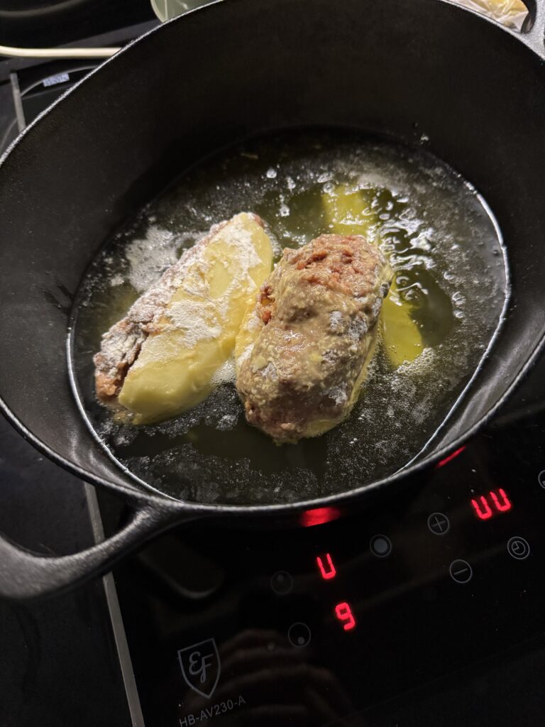 - Rol de gevulde aardappelen eerst door de bloem en vervolgens door het losgeklopte ei.