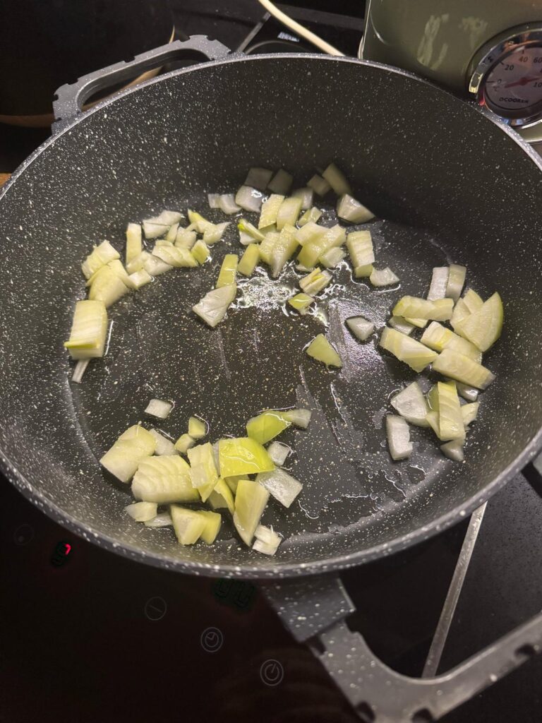 - Verhit de olie op middelhoog vuur en fruit de ui tot deze zacht en gekarameliseerd is. Voeg knoflook, gember en jalapeño toe en bak 1-2 minuten mee.