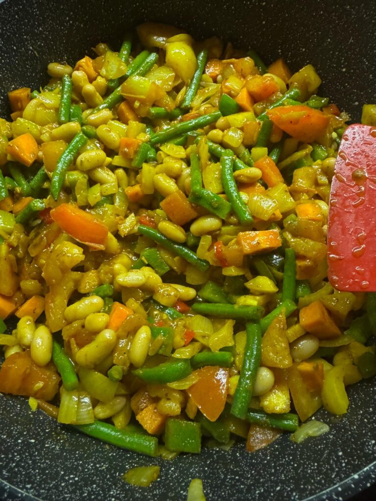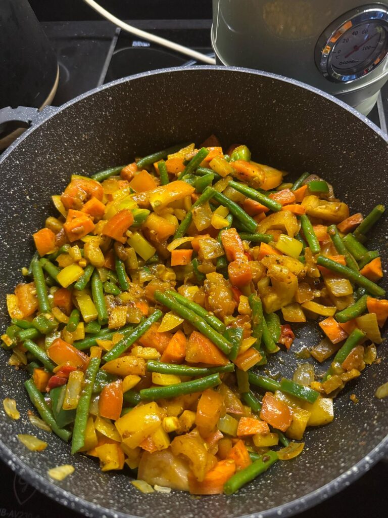 - Zet het vuur iets lager en voeg de sperziebonen, paprika’s en wortel toe. Meng goed door.
