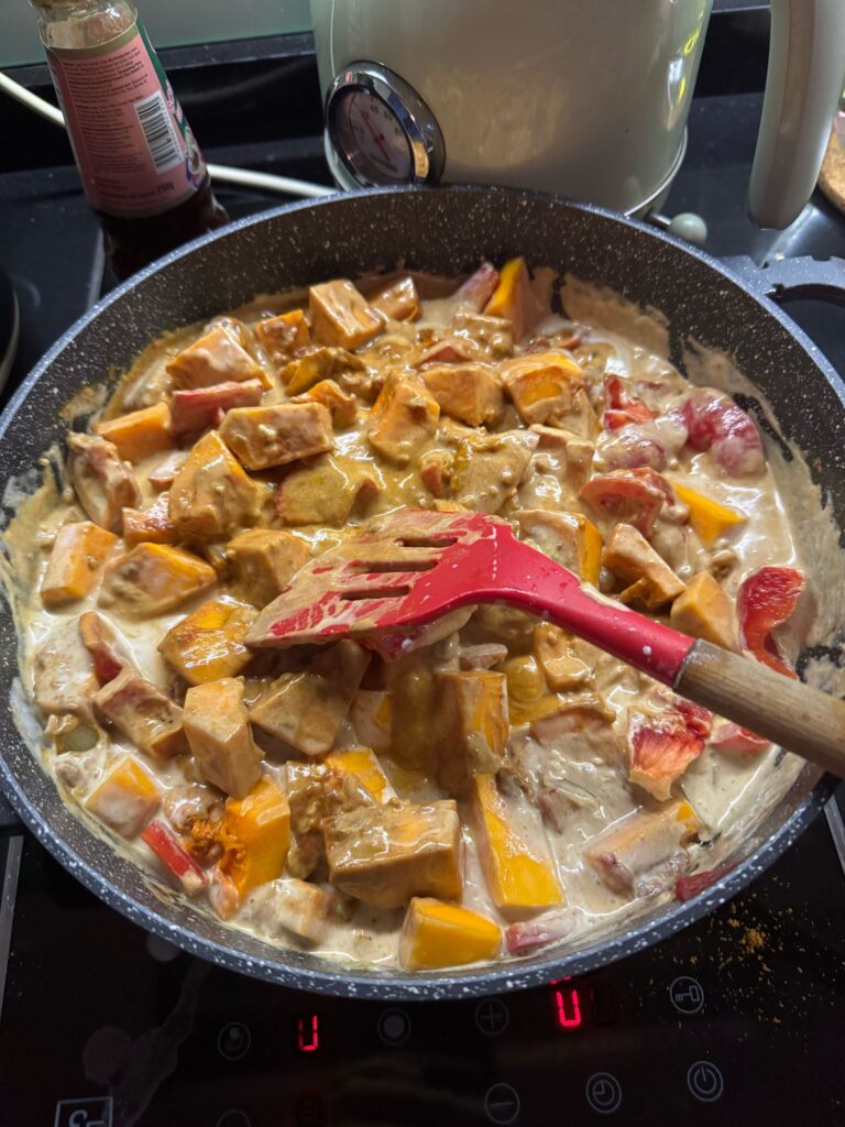 7. Voeg de kokosmelk en de paprika en aardappel/pompoen toe. Laat 30 minuten inkoken.