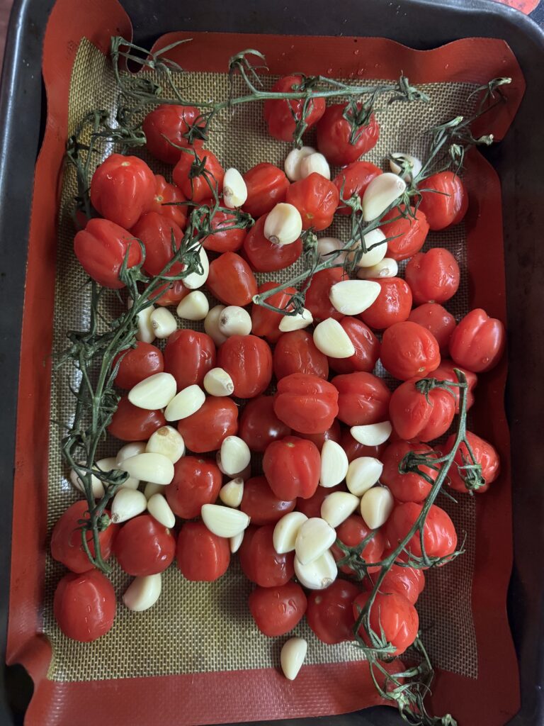 2. Verspreid de cherrytomaten, gesneden rode ui en knoflookbollen (met de gesneden kant naar boven) over een bakplaat.