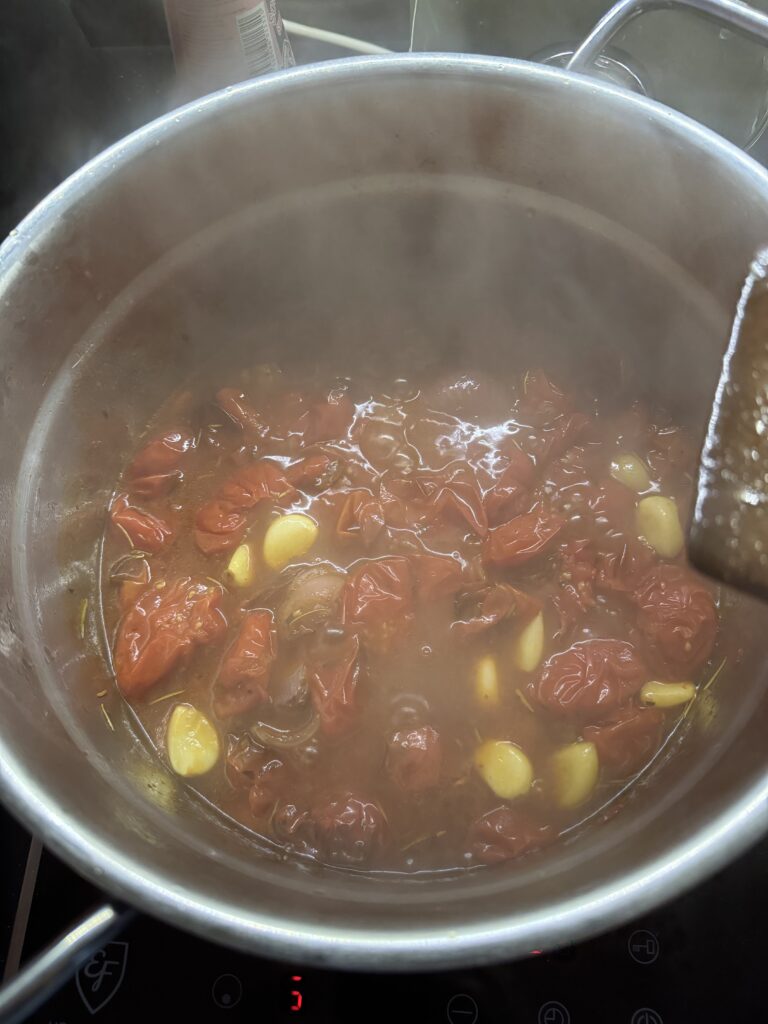 4. Rooster in de oven gedurende 30 minuten, tot de tomaten zacht zijn en beginnen te karameliseren.