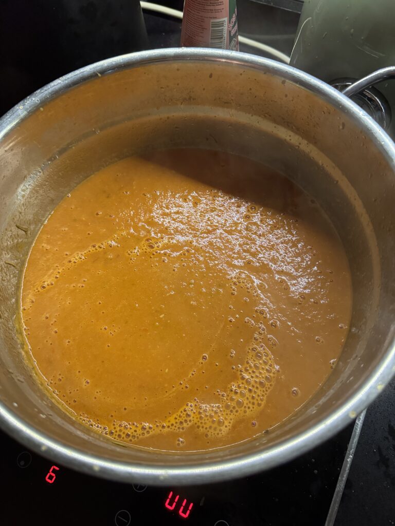 7. Mix de soep met een staafmixer tot een glad geheel. Roer de slagroom erdoor en laat nog een paar minuten pruttelen.