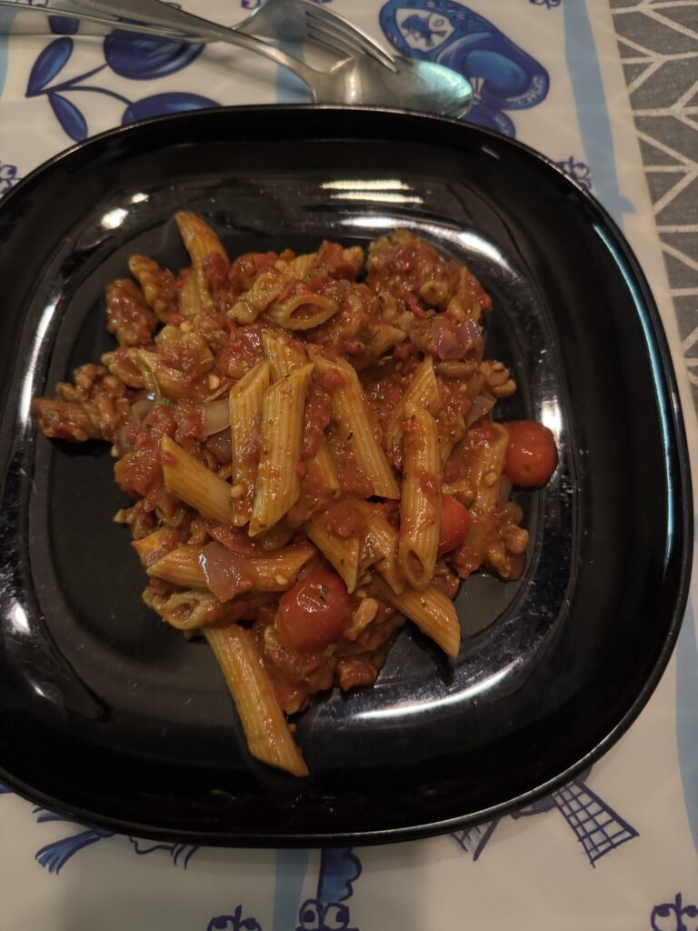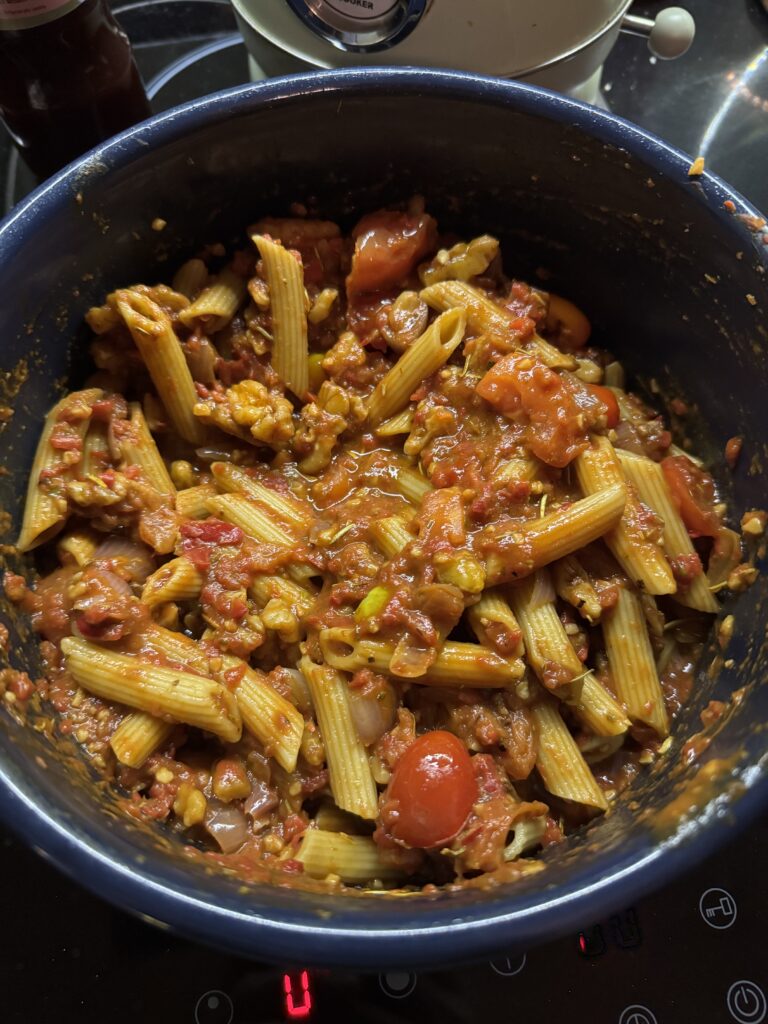 Pittig, smaakvol en vol van textuur – deze vegan pasta arrabiata met walnotengehakt is een heerlijk gerecht voor liefhebbers van de Italiaanse keuken. ‘Arrabiata’ betekent letterlijk ‘boos’ in het Italiaans, en verwijst naar de pittige rode peper in de saus. De toevoeging van walnoten zorgt voor een stevige bite en een rijke smaak, terwijl geroosterde pijnboompitten en verse basilicum het geheel afmaken. Een simpel, voedzaam en overheerlijk gerecht!