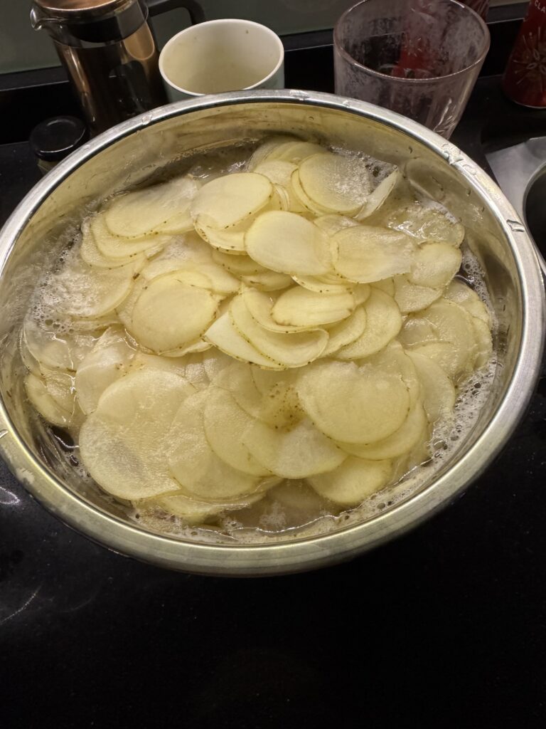 - 5 middelgrote russet aardappelen (± 800 gram of 5-6 kopjes), in dunne plakjes