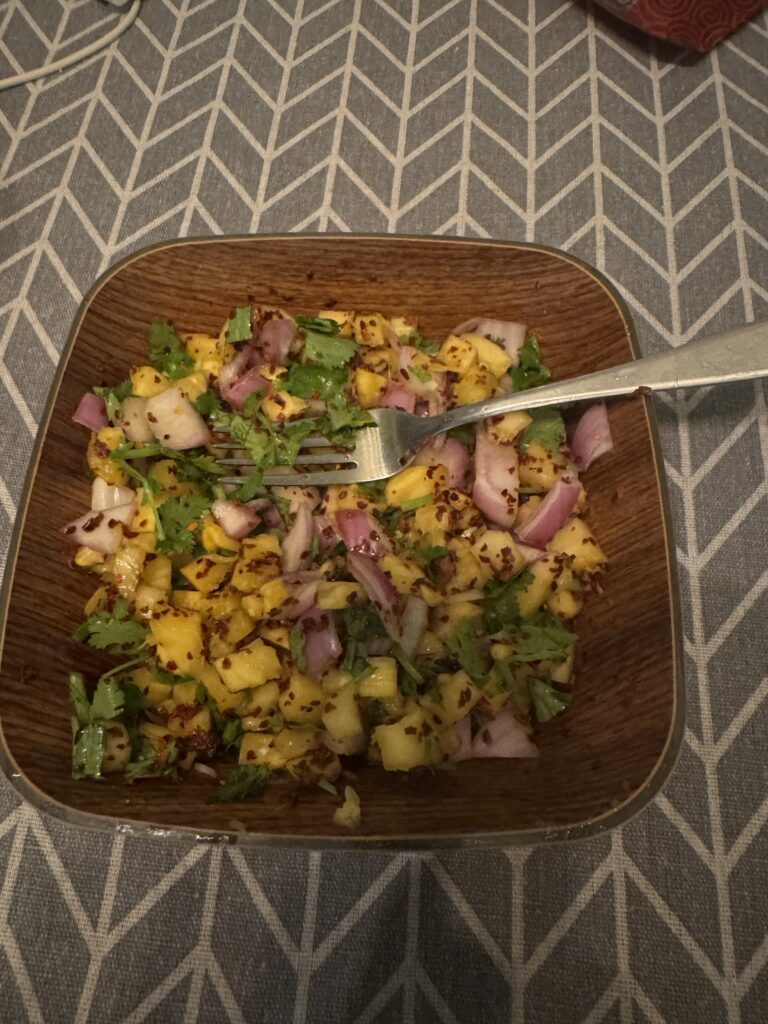 Terwijl de jackfruit suddert, meng je in een kom de ananas, rode ui, koriander, jalapeño en limoensap.