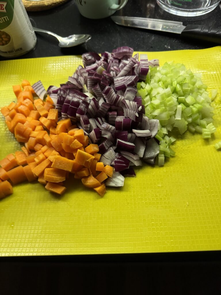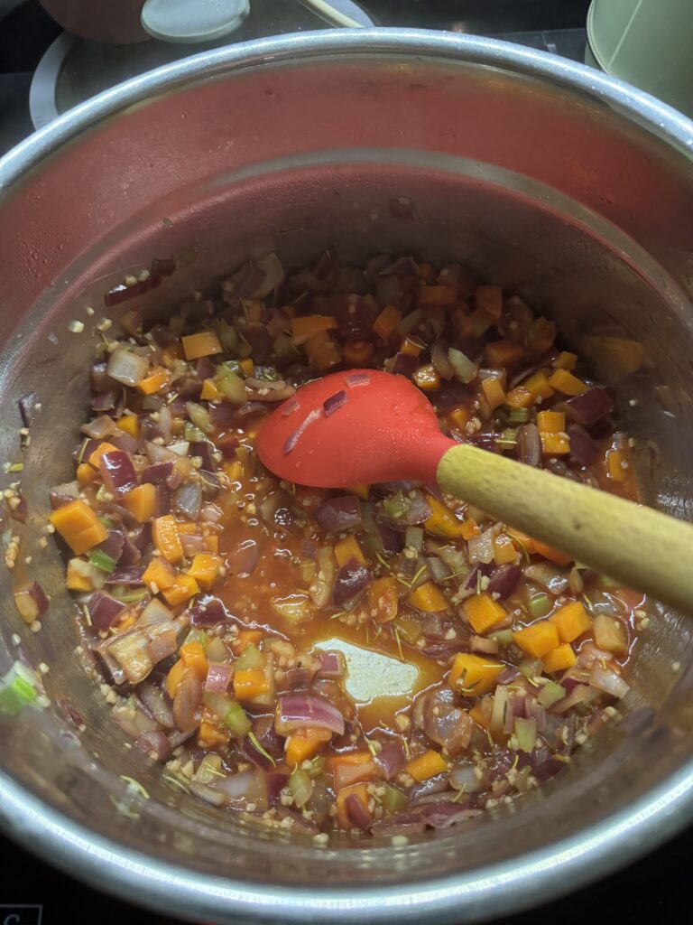 - Verhit de olijfolie in een grote pan of braadpan op middelhoog vuur. Voeg de ui, wortel en selderij toe en bak dit 3 minuten tot de groenten zacht beginnen te worden.
