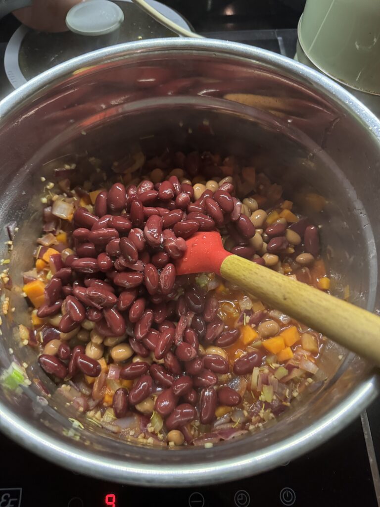 - Voeg de bonen, groentebouillon en tomaten toe. Breng op smaak met zout, zwarte peper en eventueel chilivlokken. Laat dit ongeveer 15 minuten zachtjes pruttelen.