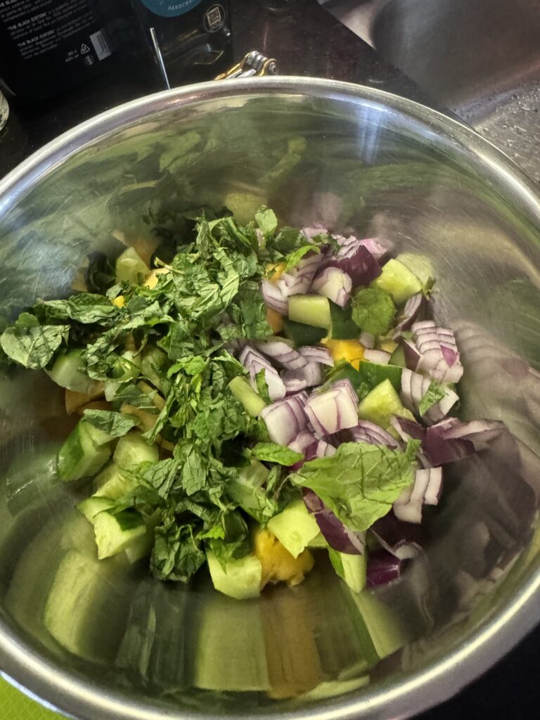 - 1 grote komkommer, in blokjes (geschild indien gewenst)